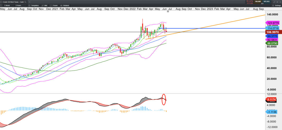 综上所述,油价下半年的趋势可概括为易跌难涨,中长期的投资者可按照逢高看空的策略进行跟踪处理。日线图来看,美国WTI原油价格昨日跌破多周期均线支撑(5,10,60),价格在周三反弹至115.8后下挫,承压于布林带中轨。周线级别MACD指标高位出现死叉,意味着顶部信号的出现。