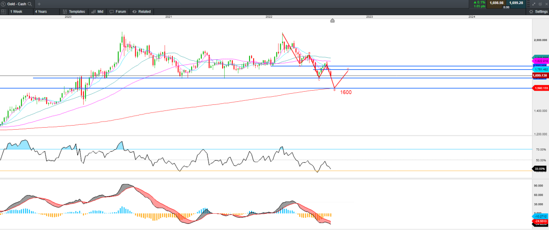从周线级别来看,黄金在7月中旬触及1680后反弹至1800上方,此为下行5浪中的4浪调整,目前价格处在下行的第五浪,价格或破前低进一步下行至250均线支撑1600附近。