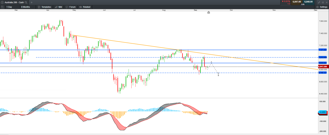 澳洲200指数在周二受美股影响大跌失守6900。从目前来看,处于震荡下行结构。6900作为重要的多空分界线很可能形成新的阻力。因此,当前策略仍以逢高看空进行。
