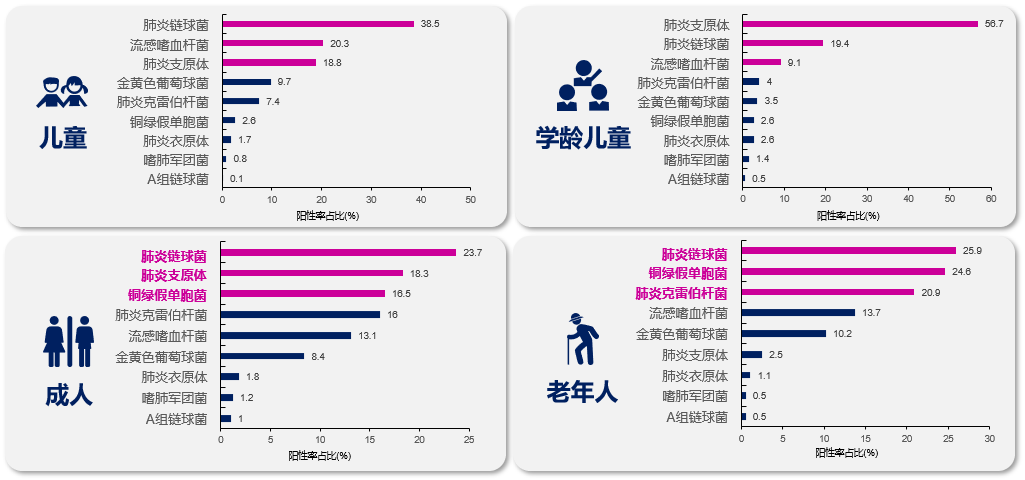 图:儿童:肺炎链球菌的占比最高,流感嗜血杆菌、肺炎支原体、金黄色葡萄球菌和肺炎克雷伯杆菌次之;学龄儿童:肺炎支原体占比最高;成人和老年人:肺炎链球菌也是引起的细菌性呼吸道感染占比最高的病原体。