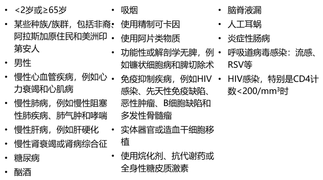 可以将众多的危险因素分成几类,一类是婴幼儿、老年人(<2岁或≥65岁);一类是免疫抑制患者,免疫抑制当中又分成两类,一是有基础疾病的情况(如慢性肺病、慢性肝病、慢性肾衰竭或肾病综合征、糖尿病、吸烟、酗酒等人群),二是更为特异的免疫抑制问题(患免疫抑制疾病,例如HIV感染、先天性免疫缺陷、恶性肿瘤、B细胞缺陷和多发性骨髓瘤,或曾经进行实体器官或造血干细胞移植、使用全身性糖皮质激素等等)。
