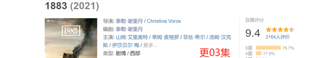 03集[在公号发送 文末右下角【】内的 关键词查看]大热西部剧[黄石]的衍生前传剧集[1883]号称剧版"荒野大镖客"!硝烟和战火,踏上西行之路,面对梦想、困境、失败…故事聚焦Dutton一家在多年前西进的旅程,他们穿越大平原前往美国最后一站蛮荒之地,在应许之地蒙大拿寻求更美好的未来。艾里奥特饰演强硬的牛仔Shea Brennan,有着非常悲伤的过去,他承担着带领一群人从德克萨斯前往蒙大拿的艰巨任务,绝不容忍蠢人。麦格罗和希尔饰演Dutton家族的男女家长James和Margaret。[猎凶风河谷][黄石][边境杀手]主创泰勒·谢里丹执导编剧。本剧共10集