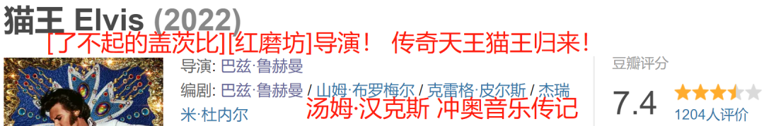 豆瓣7.4分,IMDb7.8分,烂番茄78%鲜(均分6.9),爆米花指数94%,MTC 64分。 巴兹·鲁赫曼(《红磨坊》《了不起的盖茨比》)导演的冲奥音乐传记片《猫王》奥斯汀·巴特勒饰演的猫王埃尔维斯·普雷斯利,汤姆·汉克斯饰演他的经理人汤姆·帕克。讲述猫王的崛起和鼎盛时期,影片重点是猫王和经理人汤姆·帕克之间超过20年的关系。