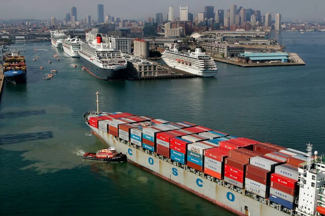 ▲中国海运货轮靠泊美国马萨诸塞州波士顿港