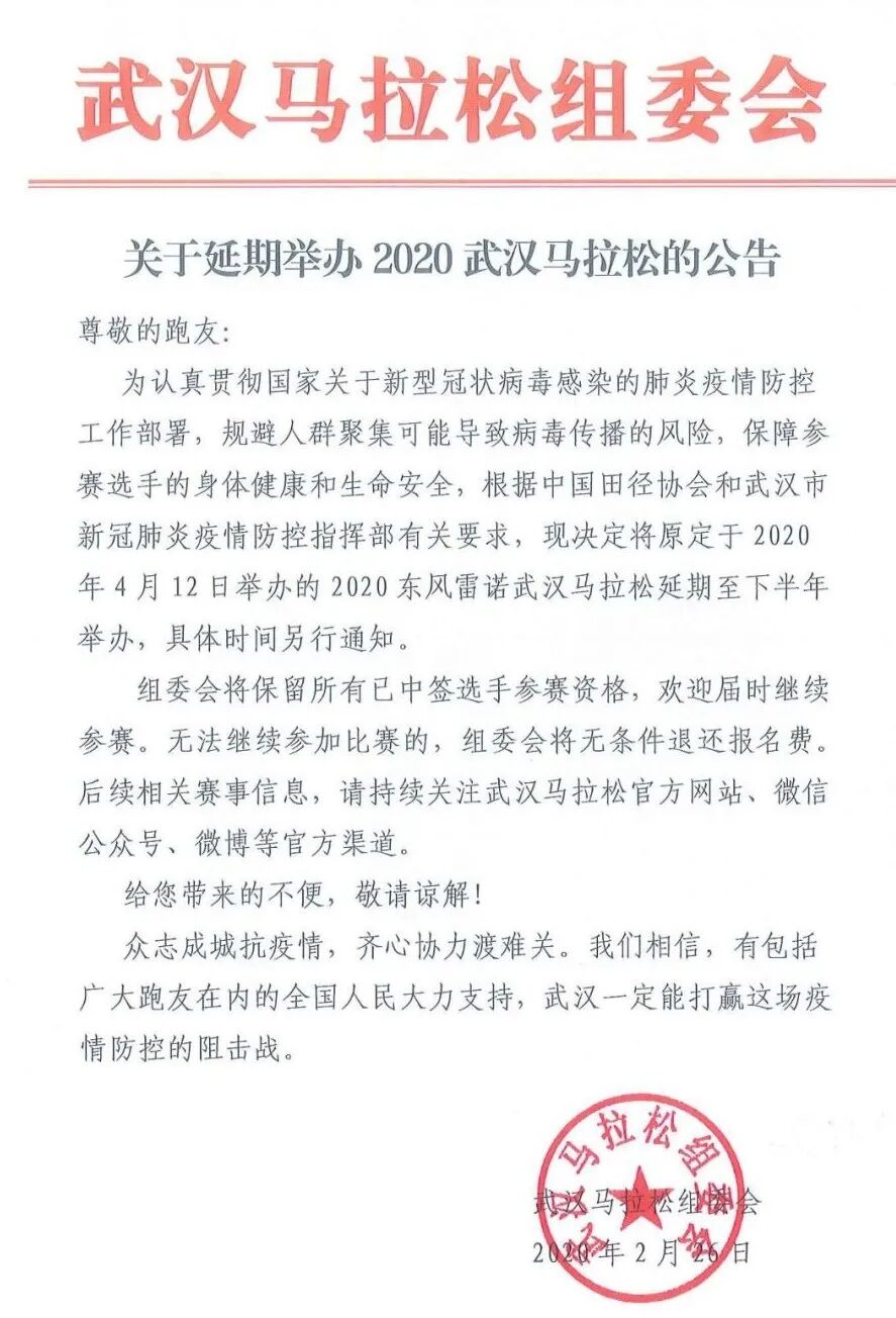 此前,武汉马拉松组委会也曾发布过通知表示 ,2020年武汉马拉松将延期至下半年举办。已经中签的跑友的名额将被保留,届时无法参赛的将无条件退还报名费。你会退费还是满怀希望期待参赛呢?