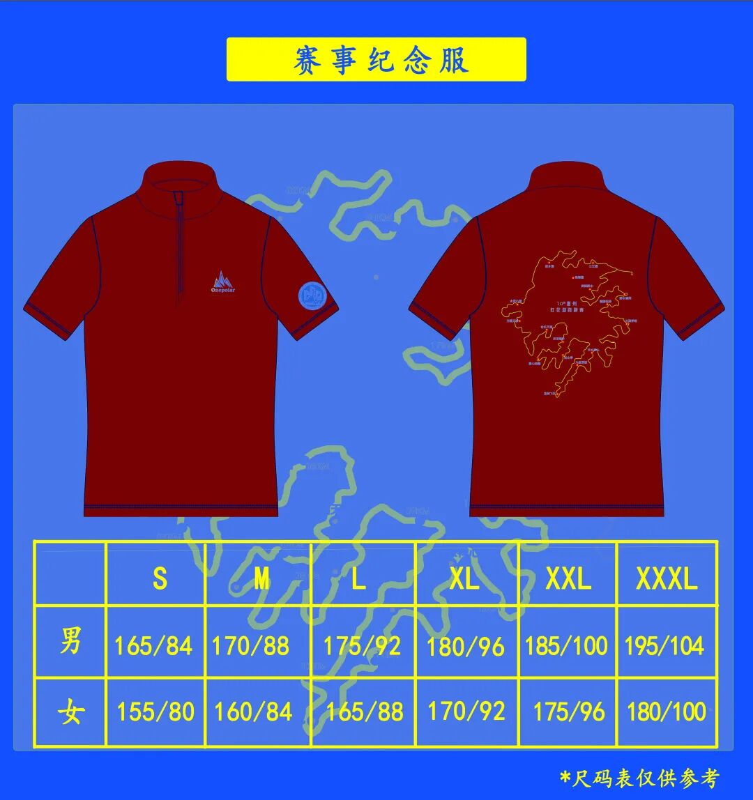 *纪念T恤为极地品牌拉链立领款,红色速干面料。右下摆有磨房惠州的60公里LOGO标志。市场零售价268元。尺码数量以上面表格为准,标准尺码,分男女款。请根据个人需求选择衣服尺码,一旦选择不给予更改退换,务请谨慎选择。
