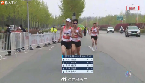 跑到30公里的时候,男子第一集团只剩下:董国建、彭建华、杨绍辉、粟国雄、陈天宇。也是在30公里附近的时候,赶上了女子第一集团!