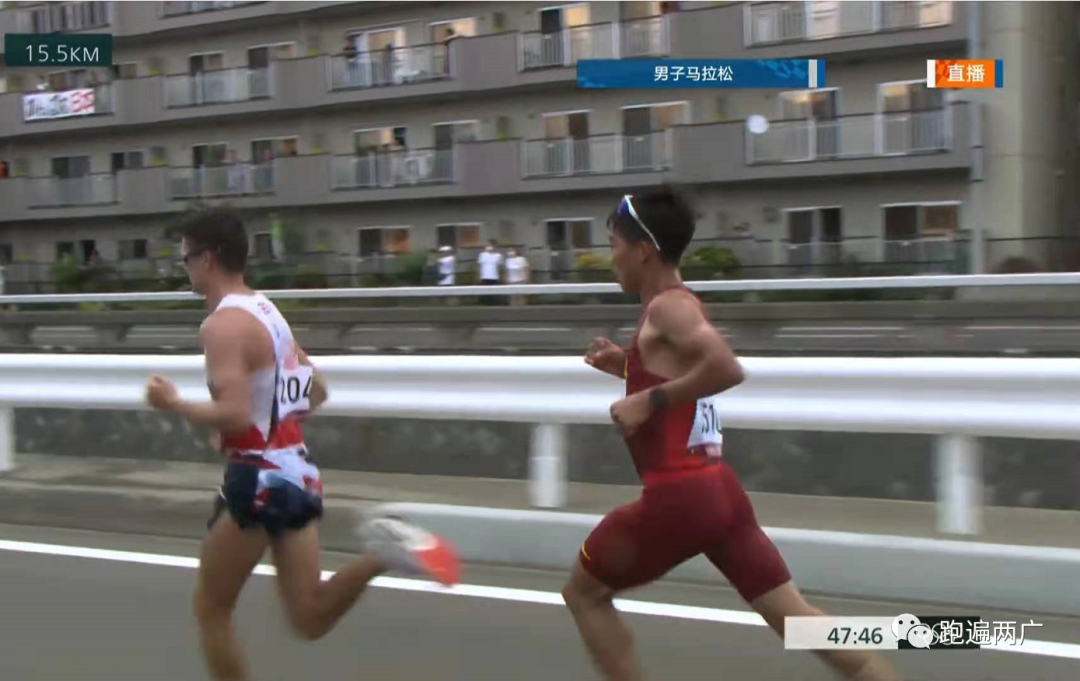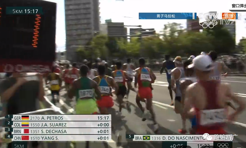 第一个五公里计时点,第一集团耗时15分17秒,杨绍辉还是在前四位。成绩显示画面中出现了董国建的成绩,显示也在第一集团里面。但是没见到露脸。