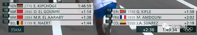 第一名基普乔格到达35公里的计时成绩为1:46:59,速度明显还是在加速!第一集团与第一名的距离相差了几十秒的距离。