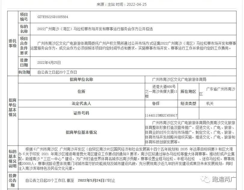 4月25日,广州产权交易所网站公共资源发布:《2022广州南沙(湾区)马拉松赛市场开发和赛事运行服务合作方公开招选(项目编号:GZ7EY622GD1005564)》;预示着广州又一场新的全马赛事正在筹备中...