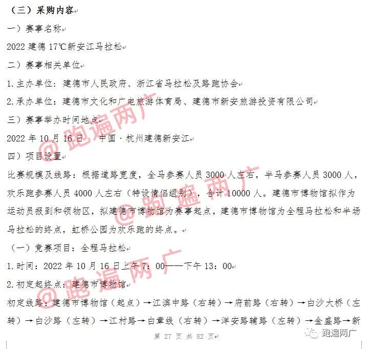 8月10日,《2022建德17℃新安江马拉松赛事采购项目的竞争性磋商公告》发布,杭州文广联合广告传媒有限公司、杭州嗨跑体育管理有限公司(联合体)以247.5万中标运营,这也意味着赛事的筹备工作已经启动。