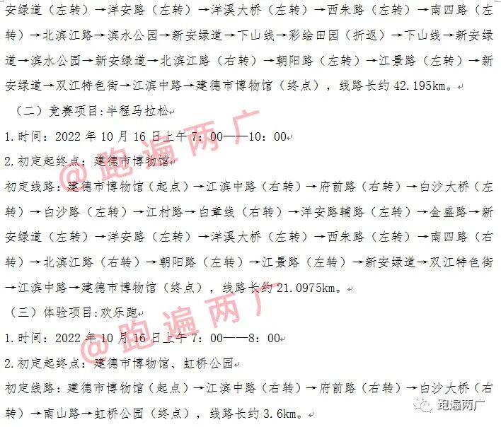 拟定建德市博物馆为赛事起点,建德市博物馆为全程马拉松和半程马拉松的终点,虹桥公园为欢乐跑的终点。