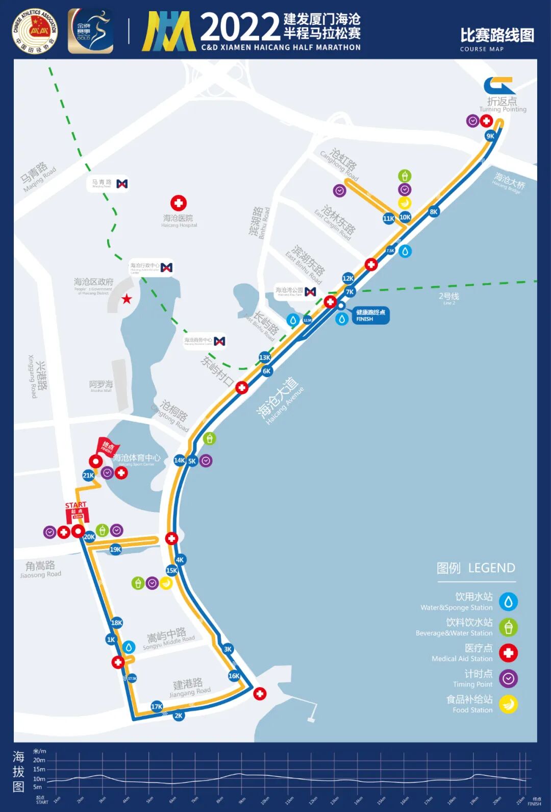 (一)半程马拉松路线:兴港路角嵩路路口(起点)→兴港路→建港路→海沧大道→海沧大道嵩屿中路路口(变辅道)→海沧大道沧桐路路口(变主道)→海沧大道近渔人码头处(折返)→海沧大道→沧虹路→沧虹路(折返)→沧虹路→海沧大道→海沧大道沧桐路路口(变逆向)→海沧大道嵩屿中路路口(变正向)→海沧大道→建港路→兴港路→角嵩路→角嵩路(折返)→角嵩路→兴港路→兴港路北师大附校处(变辅道)→湖岸南路→海沧体育中心→海沧体育中心体育场(终点)