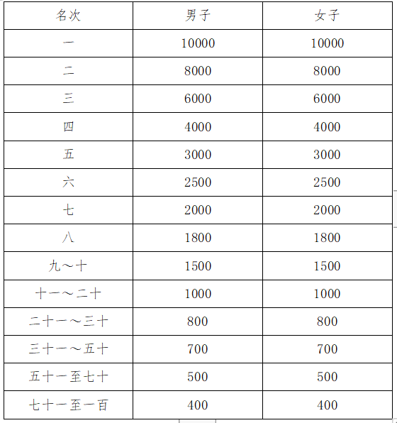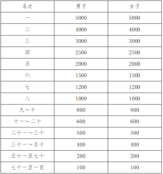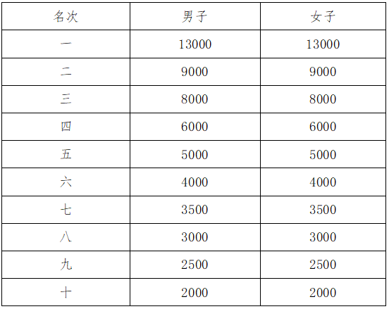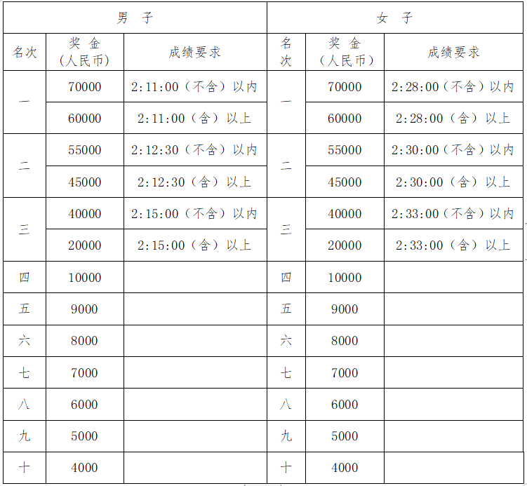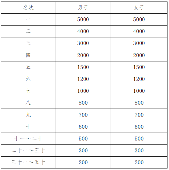 (1)总名次奖金(按枪声成绩录取)(单位:人民币)①奖励对象:中国籍(含港、澳、台)及华侨参赛选手; ①奖励对象:获得参赛资格的全程跑团(20人成团,至少1名为女性跑者); ②奖励办法:取每个参赛跑团中前15名的选手成绩进行累计,若前15名中无女性跑者的,第15名的成绩取该跑团中女性跑者第一名的成绩,总用时少的跑团,名次列前。如无女性跑者完赛,该跑团成绩不计入跑团奖排名。若成绩相等,则以各跑团成员中第一名成绩优者列前,以此类推;排名前20名的跑团分别给予奖金;![]()