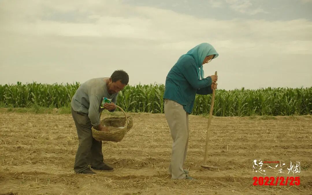 影片中大量展示曹贵英和马有铁夫妇在田间地头劳作的场景:佝偻着播种、卖力地犁地、辛劳地收割、赶着驴子一圈圈地碾磨、运送一捆一捆堆得小山高的麦秸……