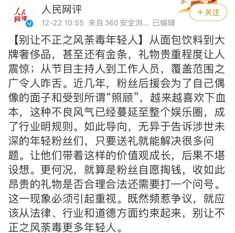 “如此导向,无异于告诉涉世未深的年轻粉丝们,只要送礼就能解决很多问题。”