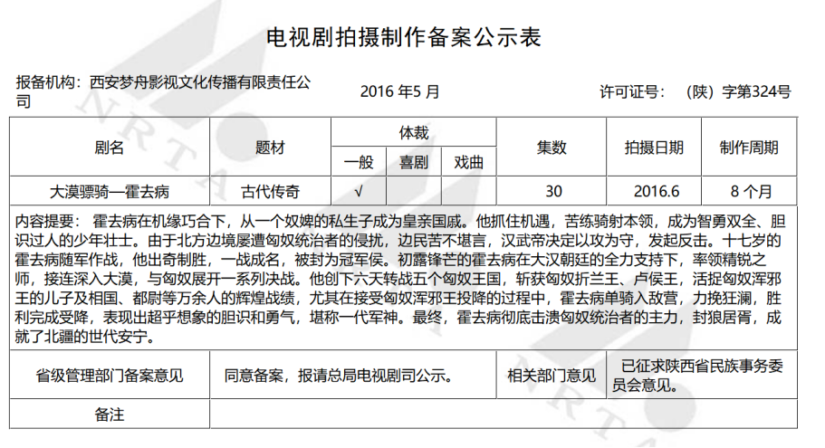 同样以“古代传奇”备案、2017年杀青的《霍去病》(张若昀主演),据说因对霍去病的出身和经历进行“魔改”(从权贵后代改为“小兵”),遭到历史粉的抵制,甚至有观众写信举报,该剧至今没有下文。