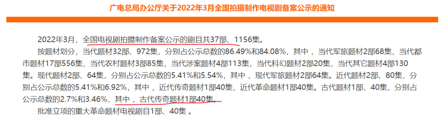 而刚刚过去的2022年3月,37部备案电视剧,古代题材仅有1部。