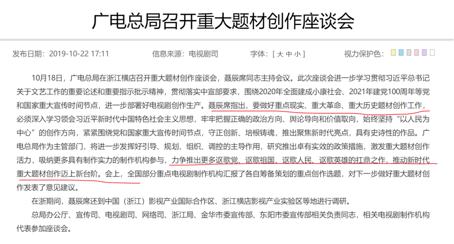 2019年,广电总局开了一个重大题材创作座谈会,提到重大历史题材,强调的也是“力争推出更多讴歌党、讴歌祖国、讴歌人民、讴歌英雄的扛鼎之作,推动新时代重大题材创作迈上新台阶”。