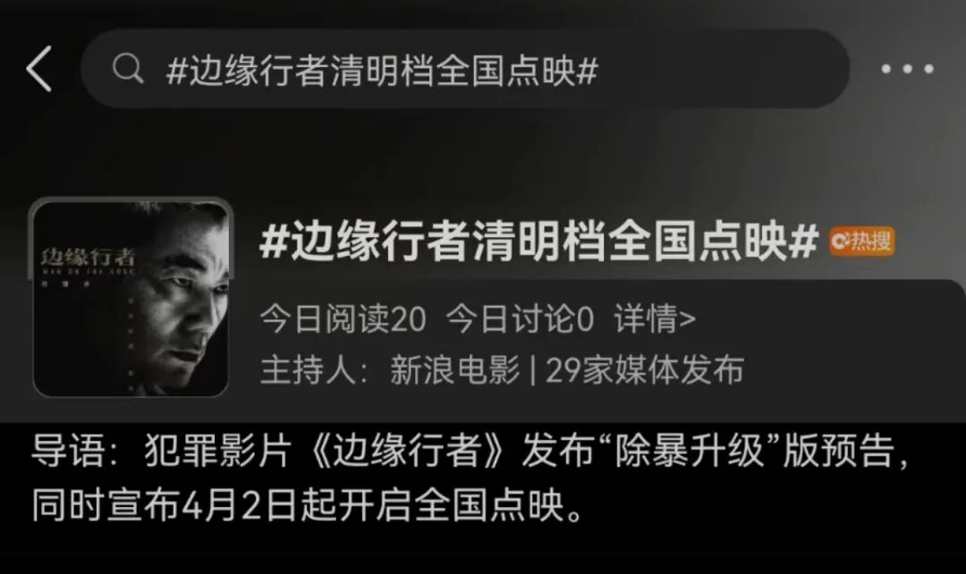 就在整个市场愁云惨雾之际,原本定档4月15日的《边缘行者》高调宣布从4月2日开启全国大规模点映。这个动作被解读为救市行为,直接刷屏了影院、影管端的朋友圈,也顺利登上了微博热搜。