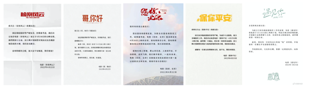 4月22日《检察风云》《哥,你好》《您好,北京》三片连撤,紧接着《保你平安》《遇见你》也取消五一公映计划。