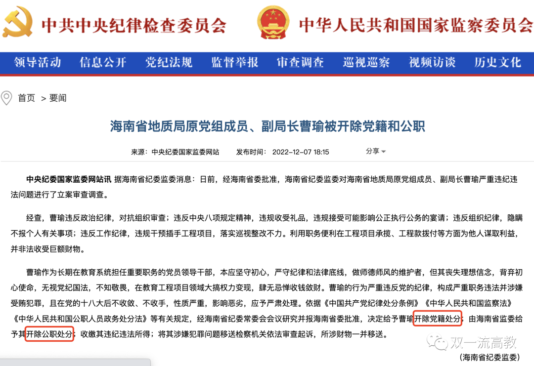 官方履历显示,曹瑜出生于1969年6月,中共党员,研究生学历,工学博士学位。曹瑜曾历任海南省三亚市人民政府副秘书长(正处级),三亚市教育局局长、党组副书记、党组书记,琼州学院党委副书记、纪委书记等职。2015年12月,曹瑜任海南大学党委副书记,为正厅级。2016年7月,他调任海南热带海洋学院党委副书记、院长。2017年12月,曹瑜任海南省地质局党委委员、副局长,今年6月9日被查。12月7日晚,海南省纪委监委公布了对曹瑜审查调查的结果:开除党籍、开除公职处分;收缴其违纪违法所得;将其涉嫌犯罪问题移送检察机关依法审查起诉,所涉财物一并移送。据通报,经查,曹瑜违反政治纪律,对抗组织审查;违反中央八项规定精神,违规收受礼品,违规接受可能影响公正执行公务的宴请;违反组织纪律,隐瞒不报个人有关事项;违反工作纪律,违规干预插手工程项目,落实巡视整改不力。利用职务便利在工程项目承揽、工程款拨付等方面为他人谋取利益,并非法收受巨额财物。通报称,曹瑜作为长期在教育系统担任重要职务的党员领导干部,本应坚守初心,严守纪律和法律底线,做师德师风的维护者,但其丧失理想信念,背弃初心使命,无视党纪国法,不知敬畏,在教育工程项目领域大搞权力变现,肆无忌惮收钱敛财。曹瑜的行为严重违反党的纪律,构成严重职务违法并涉嫌受贿犯罪,且在党的十八大后不收敛、不收手,性质严重,影响恶劣,应予严肃处理。曹瑜在教育行业工作了20多年,先后在海南三所高校担任领导职务,还担任过纪委书记,曾多次在干部大会上就廉洁从教发表讲话,然而他台上讲廉洁,台下却在教育工程项目领域大搞权力变现。早在2009年在三亚市教育局局长的任上,在当年8月召开的三亚市教育局党风廉政建设警示教育大会上,面对全市各中小学校校长以及局机关全体工作人员,曹瑜表示,身边的违纪、违法案件再一次说明,在社会主义市场经济大潮中,在教育领导体制和管理机制不断完善的过程中,如果没有过得硬的人生底线,就会失去拒腐防变的“篱笆”,就会坠落违纪乃至犯罪的深渊。为此,全市各级各类学校校长、中层干部,局机关、局直单位的同志务必保持清醒的头脑,深刻认识加强教育系统党风廉政建设的重要性,时刻用身边的反面典型警示自己,努力打造一支廉洁的教育队伍。曹瑜最终没有扎紧拒腐防变的“篱笆”,坠入贪腐的泥沼。近年来,海南高校反腐颇受关注。此前,海南省高教界曾暴发一起贪腐窝案。中央纪委国家监委网站曾刊文《“一方净土”何以沦为贪腐“重灾区”》,剖析海南省琼台师范学院腐败窝案。文章披露,琼台师范学院原党委副书记、校长程立生,原党委副书记、纪委书记陈福川以及已退休的原党委书记李向国等3人,本应是学校改革发展的领军人,全校师生教育的引路人,却在权力和金钱面前迷失方向,陷入违法犯罪的深渊。2017年12月,因违反中央八项规定精神、滥用职权造成国家经济损失、利用职务上的便利为他人谋利并收受财物等,程立生、陈福川被开除党籍和公职,李向国被开除党籍、取消退休待遇。3人均被移送司法机关依法处理。此外,今年5月30日,海南省纪委监委发布消息:海南省委巡视组原组长,海南师范大学原党委书记林北平接受审查调查。林北平曾任海南省教育厅副厅长,海南师范学院党委书记,海南师范大学党委书记、海南省社会科学界联合会副主席(兼),海南省委巡视组组长(正厅级),2017年9月退休。值得注意的是,曹瑜落马一个多月后,他的顶头上司也被查了。