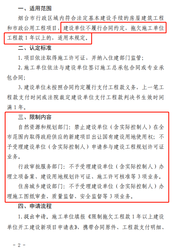 导读:近日,烟台市住建局发布《关于限制拖欠工程款1年以上建设单位(含实际控制人)开工建设新项目的通知》,明确:烟台市行政区域内符合法定基本建设手续的房屋建筑工程和市政公用工程项目,建设单位不履行合同约定,拖欠施工单位工程款 1年以上的,适用本规定。