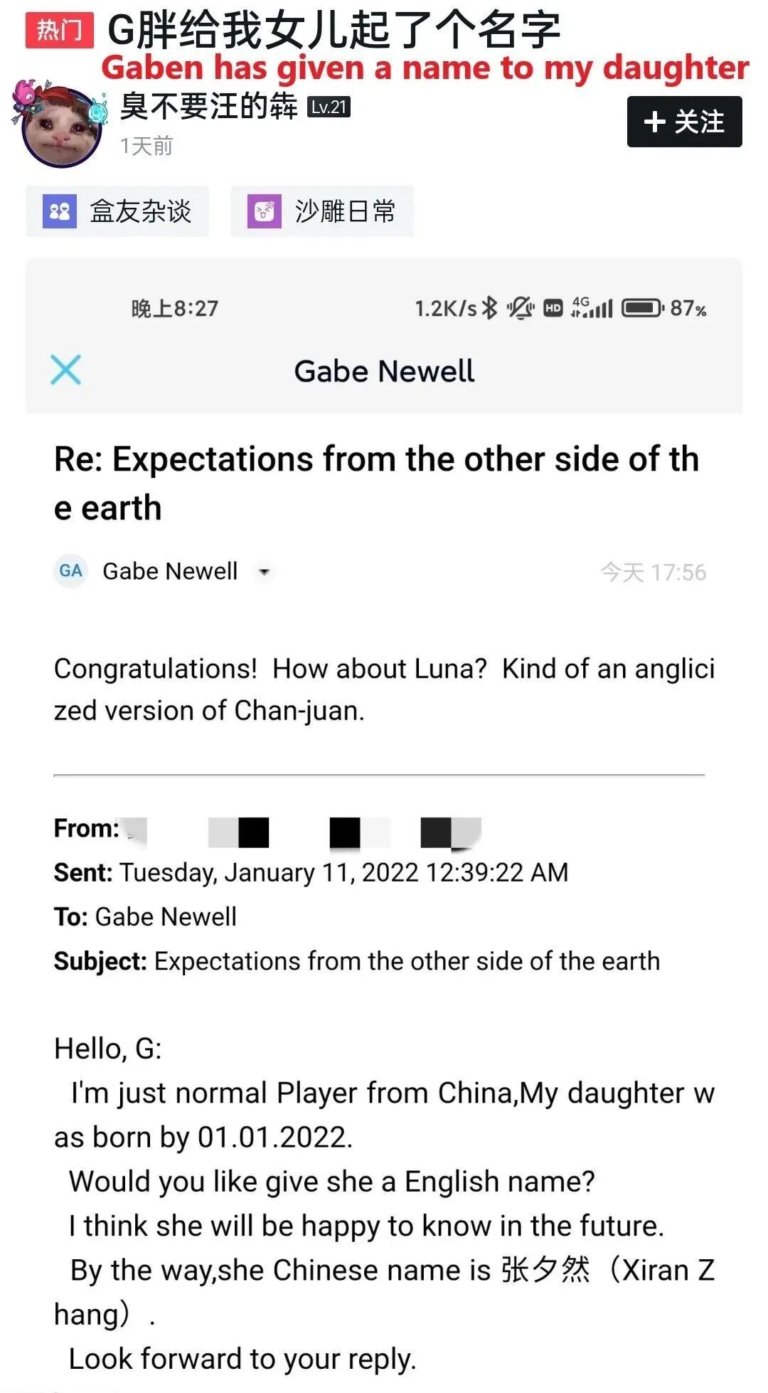 前几天发生了个挺有意思的事,一位叫“臭不要汪的犇”(读ben)的小黑盒网友说自己给G胖发邮件,希望G胖能为他元旦出生的女儿起个英文名,小姑娘长大后一定会高兴。