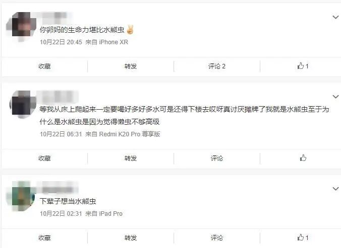 当你在传播这些短漫的时候,你不需要知道故事主角的名字,不会好奇它为啥有6只手,更不会在意这个物种为了熬过小行星的坠落做了多大的努力,你只会熟练地打出:“哈哈,这不就是我”,然后就把这个图传递给下一只“小熊虫”。