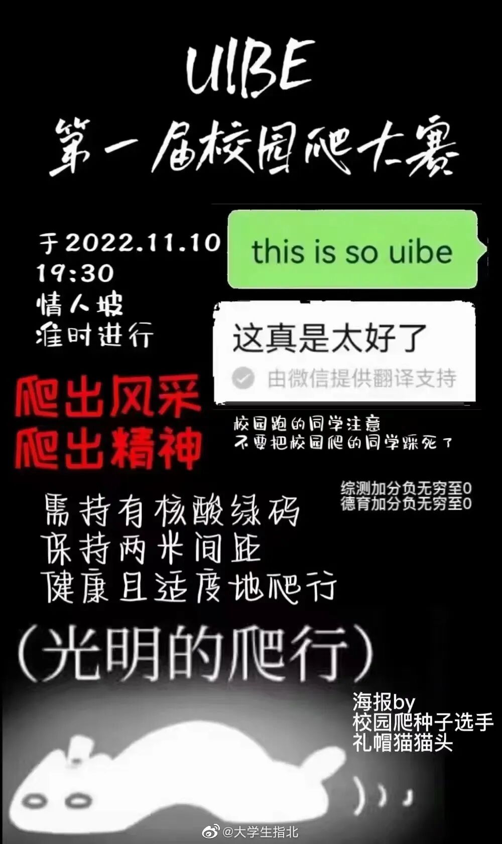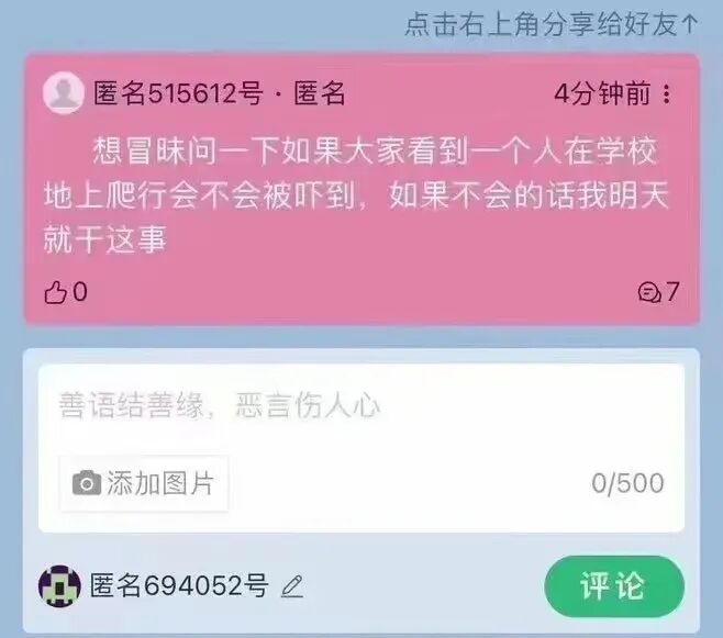 或许是为了反驳这些一切想法都往裤裆上扯的网友,11月9日,中国传媒大学的匿名论坛出现了一条帖子询问“如果大学看到一个人在学校地上爬行会不会被吓到,如果不会的话我明天就干这事”。