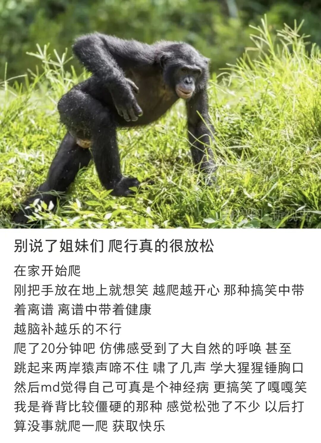 当手掌和膝盖放在同一个水平面上时,远古猿人时期的记忆开始苏醒,浑身的血脉开始涌动。据参与爬行活动的大学生们所说,在地上绕圈爬了半小时之后,腰也不酸了头也不昏了人也不丧了。