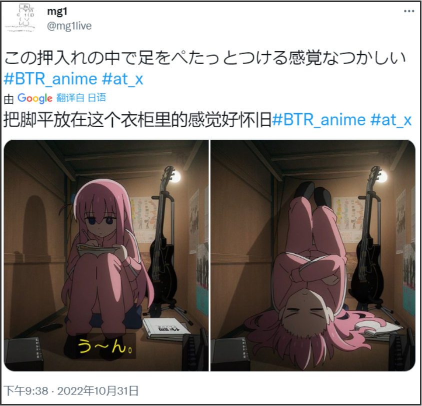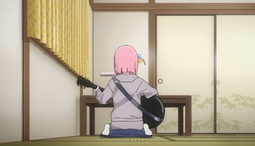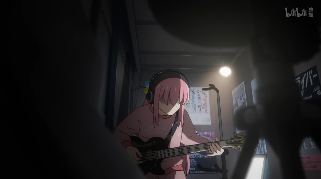 就拿这个季度我最喜欢的《孤独摇滚》来说,主角“波奇”一开始学习、演奏吉他是在自己的房间里。