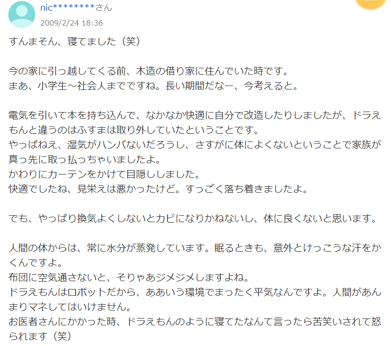 知惠袋(可以把它当成日本的“知乎”,一个提问的平台)上曾经也有人疑惑“壁橱到底能不能睡觉?”,疑惑的问题不外乎“壁橱是一个比较封闭的空间,在里面睡觉不会觉得闷吗?”或者“壁橱长时间没有办法接触阳光,会生虫发霉吗?”