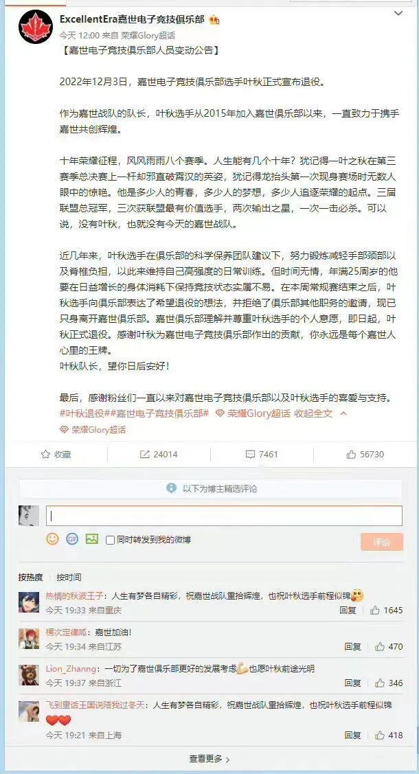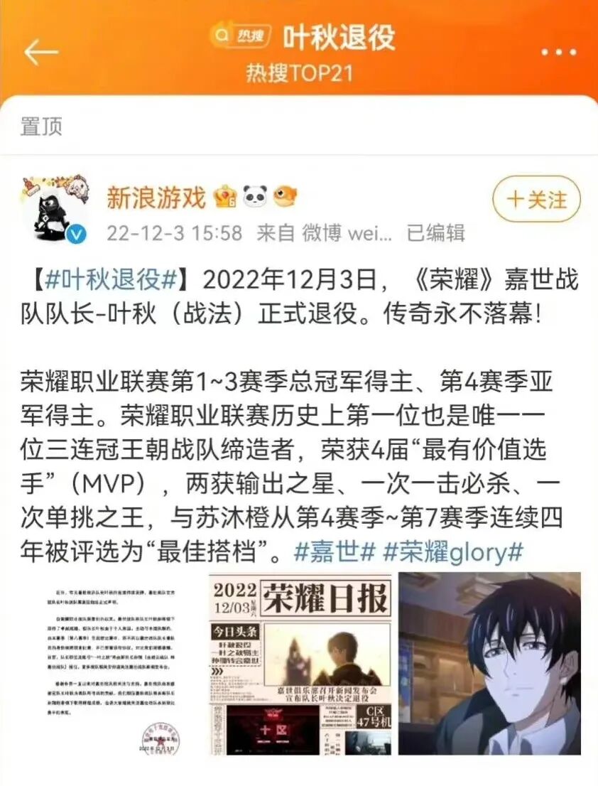 2022年12月3日(上周六),嘉世电子竞技俱乐部官方宣布:前战队队长、《荣耀》职业选手叶秋于当日正式退役,并表示:人生有梦,各自精彩。