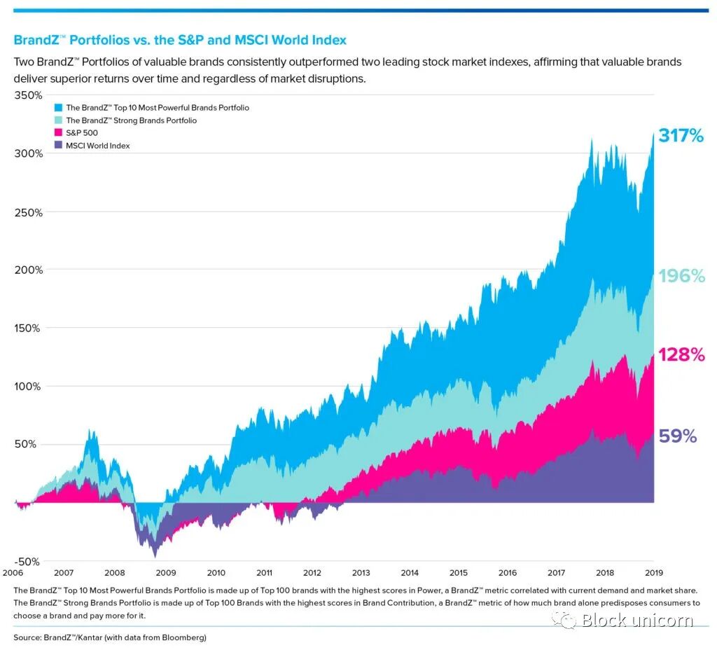 如你所见,在2006年至2019年期间,BrandZ的强大品牌投资组合的表现显著优于MSCI世界指数和标准普尔500指数。尤其重要的是,即使在2007年至2009年的股市下跌期间,BrandZ指数也表现得更好,继续跑赢基准指数。因此,建立一个强大的品牌是至关重要的,因为它提供了定价权,需求的不弹性,从而提高了外部市场压力和经济低迷的弹性。