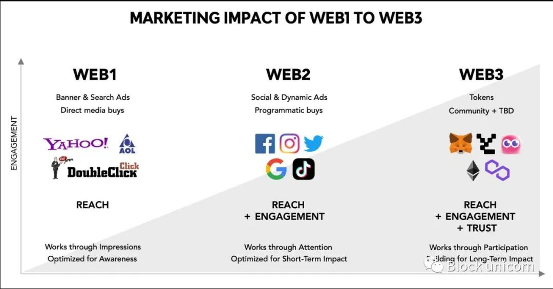 因此,当我们从营销人员的角度来看待web1、web2和web3时,它不仅仅是一个从 "阅读 "到 "读/写 "再到 "读/写/拥有 "的功能扩展。Web3代表了一种从短期到长期的根本性战略调整,这种调整是通过更高的价值参与来实现的。更具体地说,Web3是一个从 "到达 "到 "到达+参与 "再到 "到达+参与+信任 "的演变。