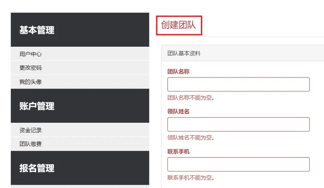 步骤二:填写团队基本资料后点击提交