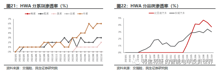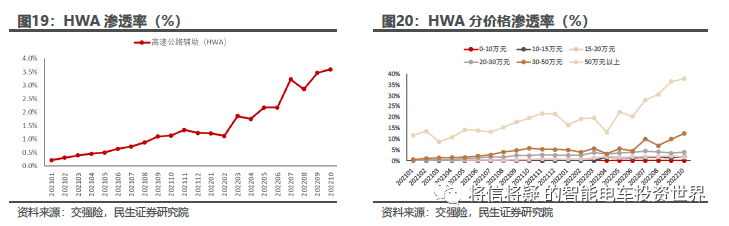 当前芯片整体车型搭载率保持稳定增长趋势,我们用L2+级别的HWA 功能渗透率来表征芯片配置情况。根据交强险数据显示,2022 年10 月HWA 渗透为3.6%,环比+0.13pct。分价格带来看,50 万以上豪华车为主要贡献车型,渗透率再创新高。