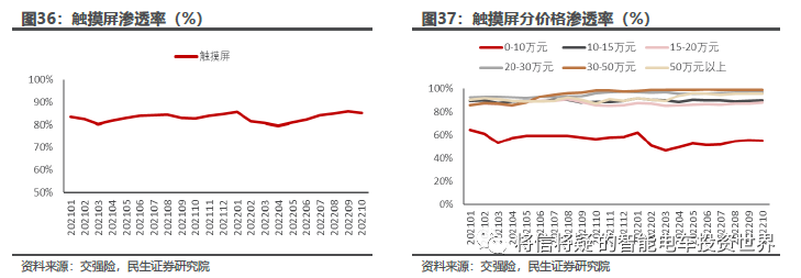 3.1.2触摸屏:触摸屏搭载率较高,10万以上车型触摸屏渗透率高于87%