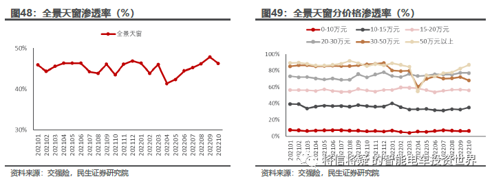 3.3.2全景天窗:20万以上车型搭载率超70%