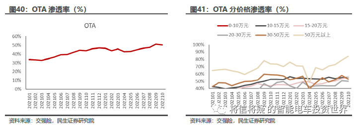 根据交强险数据显示,22M10 OTA渗透率稍有下滑,环比下降0.8pct。分价格带来看,2022年10月10-50万的车型OTA搭载率均在50%左右,50万以上车型渗透率再创新高,达到84%。