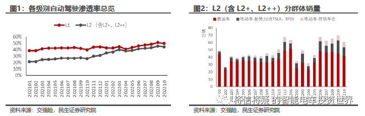 标配L2(含L2+、L2++)功能的乘用车22年10月终端渗透率达45%,智能化渗透持续高位。传统车企L2(含L2+、L2++)功能的电动车22M10销量达6.6万辆,环比略有增长。
