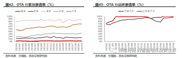 从车系来看,美系车短暂下滑,其2022M10渗透率达87%。其次,自主车型加速布局OTA,渗透率达70%。目前长城汽车、比亚迪汽车维持稳定搭载率均超90%。