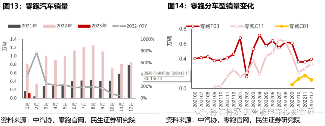 零跑1月销量达0.11万辆,同比-86%/环比-87%。C11增程将于2023年2月9日开启交付。