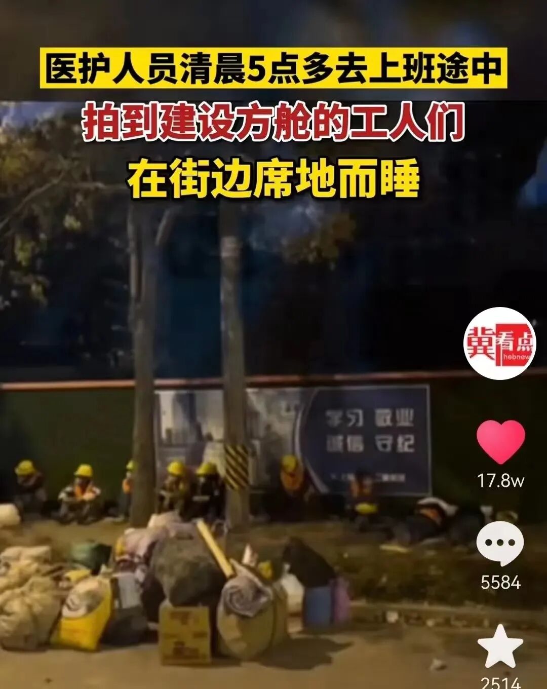 据央广网报道,上海已经建成100多个方舱医院。其中上海国家会展中心,5天时间就改建成上海最大的方舱医院。背后,是几万名农民工建设者倾尽全力地付出。他们睡在露天地铺,吃着简易盒饭,日夜赶工,不知疲倦。在方舱建好以后,他们纷纷卷起铺盖搬了出去。天为被,地当床,在街边席地而眠。