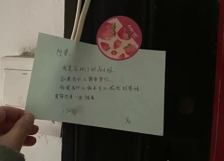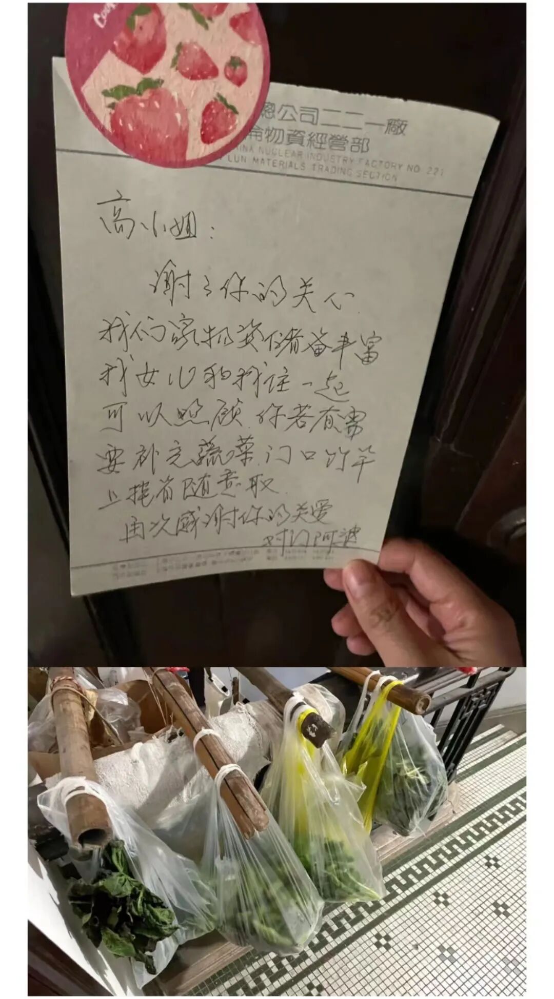 某小区封控了。高小姐给邻居九旬阿婆家门口留了张纸条:“我家还有一些储备,有需要给我打电话”。
