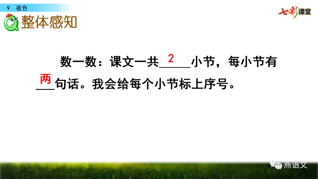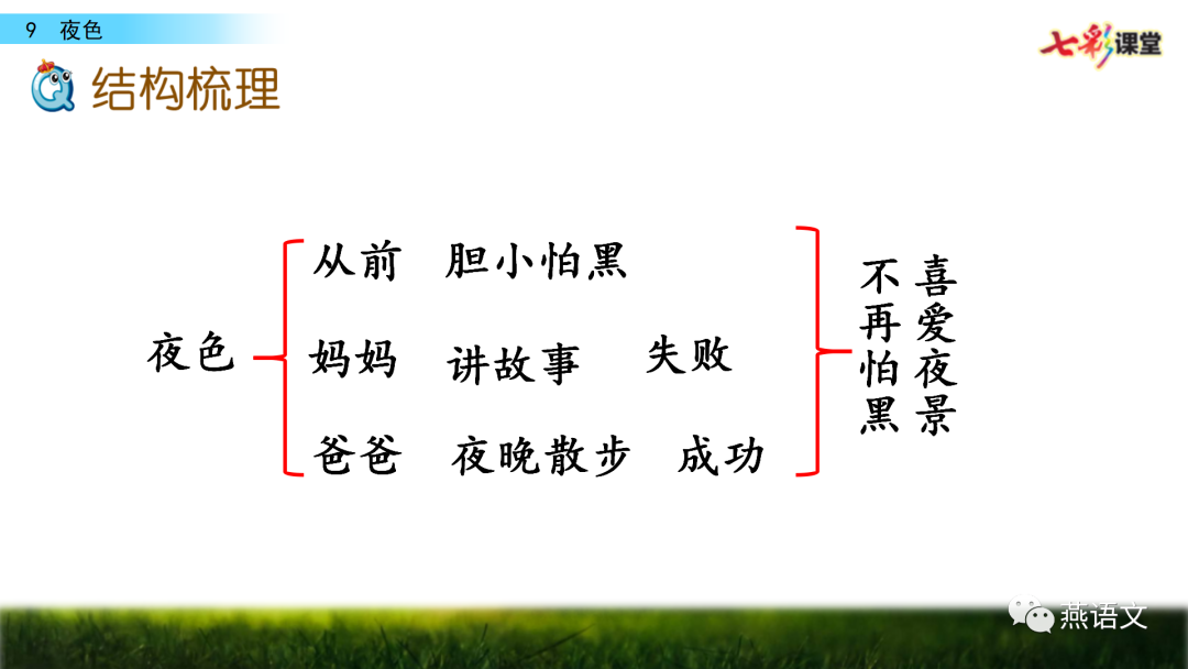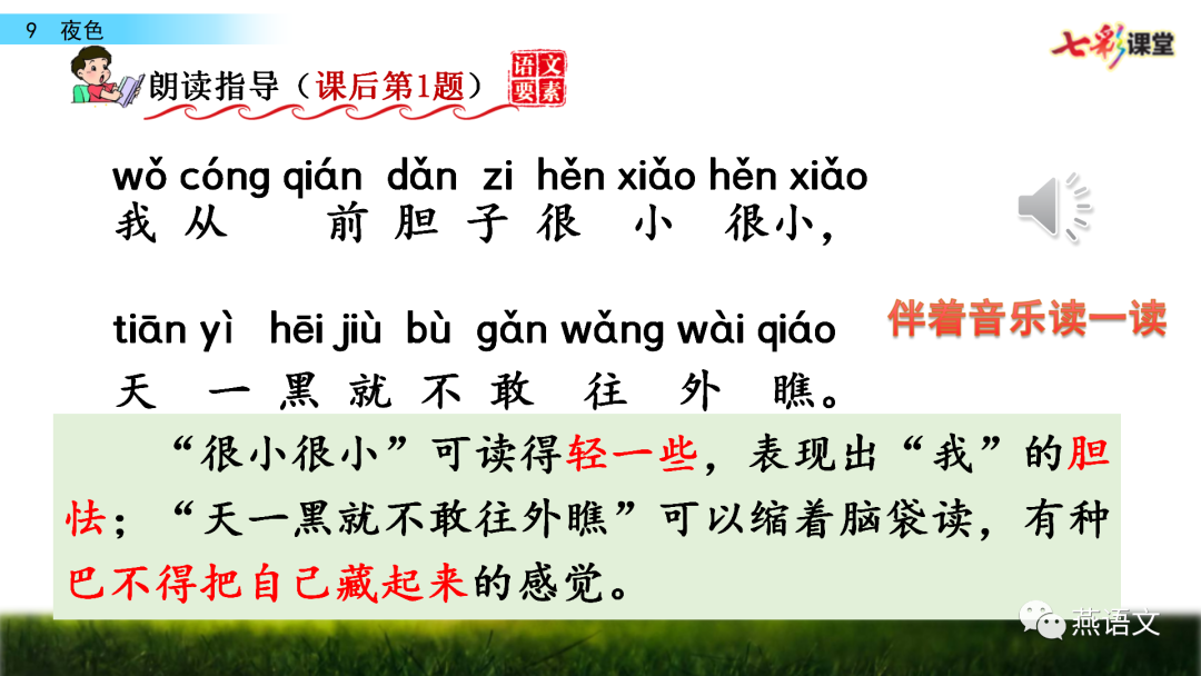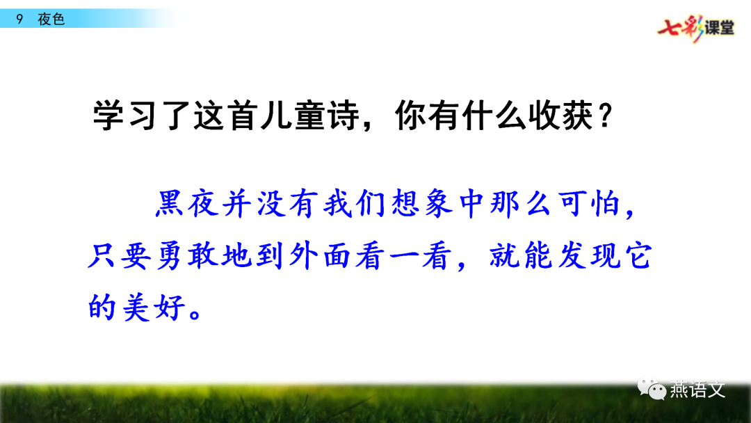 《夜色》这篇课文是一首充满童趣的儿歌。写“我”从前胆子很小,怕黑,后来和爸爸出去散步后发现夜晚也像白天一样美好,“我”不再怕黑。教育我们要做一个勇敢的孩子。