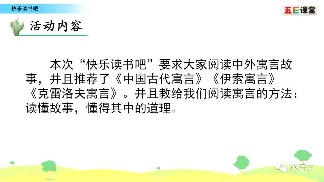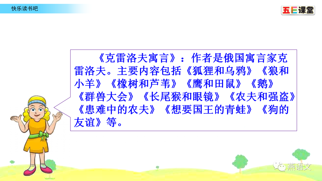 著名儿童文学家严文井曾说,寓言是个魔袋,袋子很小,却能从里而取出很多东西...言故事般比较短小。但背后往往藏着深刻的道理。