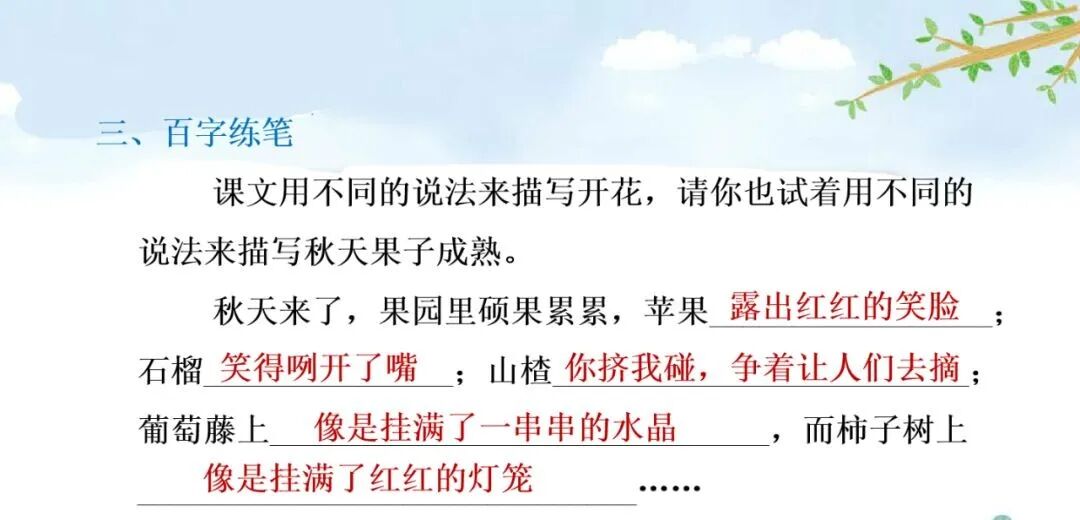 课文用不同的说法来表达鲜花的开放。填一填,体会一下。