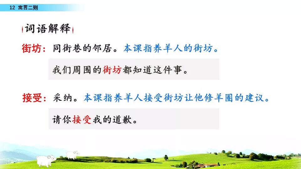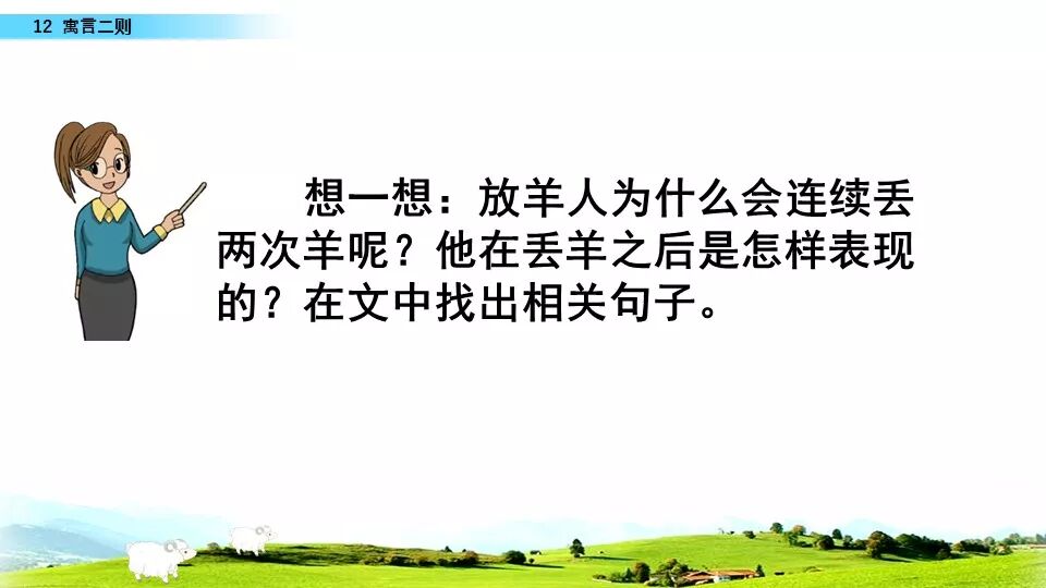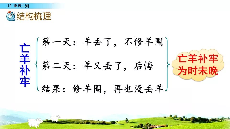 《亡羊补牢》出自《战国策·楚策》,讲的是一位养羊人第一次丢了羊,街坊劝他修羊圈、堵窟窿,养羊人没有听从劝告;第二天他又丢了羊,才后悔没有听街坊的劝告,于是赶快动手把窟窿堵上,把羊圈修好。从此,他的羊再也没丢过。这个寓言告诉我们:一个人做错了事,只要肯接受意见,认真改正,就不算晚。